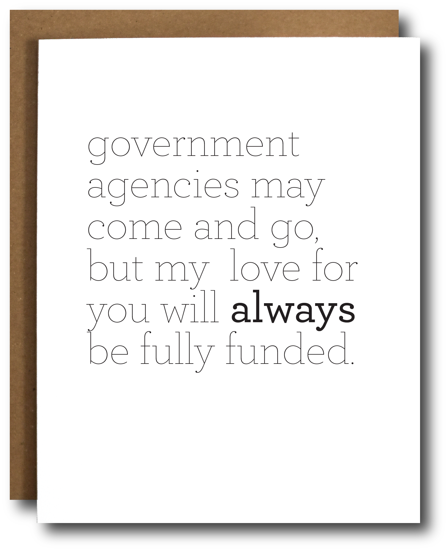 The Government Agency Love Card is a unique and charming way to express your feelings, especially for those who appreciate the nuances of government and its ever-changing landscape. This card is designed for individuals who want to convey their love and support, regardless of the political climate. With its blank interior, it provides ample space for you to write a heartfelt message, making it perfect for any occasion, whether it's a birthday, anniversary, or just a simple note to say 'I love you'. The card comes with a kraft paper envelope and sleeve, adding a rustic touch that complements its thoughtful design. Measuring A2 size at 4 1/4" x 5 1/2", it is compact yet spacious enough to hold your personal sentiments. The Government Agency Love Card is not just a card; it's a statement of love that transcends the temporary nature of government agencies. It serves as a reminder that while agencies may come and go, love remains constant and enduring. This card is ideal for those who have a passion for politics, government, or simply want to share a laugh about the current state of affairs. It can also be a great gift for friends or family members who work in government or have a keen interest in political matters. The design is both playful and poignant, making it suitable for a wide range of recipients. Whether you are looking to brighten someone's day or send a message of solidarity, this card is a perfect choice. The kraft paper envelope not only protects the card but also adds an eco-friendly element to your correspondence. The Government Agency Love Card is printed on high-quality cardstock, ensuring that it feels substantial in hand and looks great on display. This card is a wonderful way to connect with loved ones, especially during times of political uncertainty. It encourages open communication and heartfelt expression, reminding us that love is the most important thing we can share. The card's unique theme makes it a conversation starter, allowing you to share your thoughts on government and love in a light-hearted manner. It’s perfect for those who appreciate humor in their relationships and want to convey that sentiment through their correspondence. The Government Agency Love Card is also a great addition to any card collection, providing a fun and quirky option for various occasions. Whether you are sending it to a partner, a friend, or a family member, it is sure to bring a smile to their face. The card's design is versatile enough to suit any recipient, making it a thoughtful gift for anyone who values love and connection. In a world where government agencies may be fleeting, this card serves as a reminder that love is everlasting. It’s a perfect way to show that no matter what happens in the political arena, your feelings remain strong and unwavering. The Government Agency Love Card is not just a piece of paper; it’s a heartfelt message that can brighten someone’s day and strengthen your bond. So, whether you are celebrating a special occasion or simply want to reach out to someone you care about, this card is an excellent choice. It embodies the spirit of love and resilience, making it a meaningful addition to your stationery collection. Don’t miss out on the opportunity to express your feelings with this unique card that captures the essence of love amidst the complexities of government.