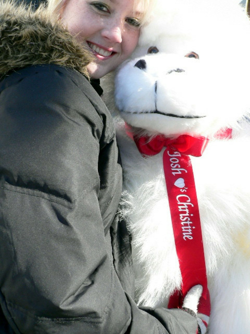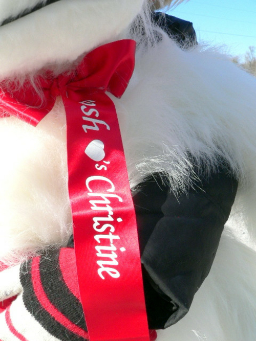 The best part is that you can personalize the red ribbon around his neck, with up to eight words that you fill-in above on this page.