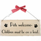 A shabby chic style Pets Welcome design wooden wall plaque with a gingham patterned bow.Q