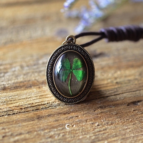 Nature’s good luck charm. Presented in an antique bronze pendant and sealed in resin, the vibrant green 4 leaf clover represents faith, hope, love and luck.