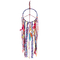Colourful and brightly patterned dreamcatcher decorated with feathers and a peace symbol design. Dimensions: H60cm x W18cm x D1cm; Material: Fabric