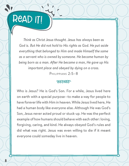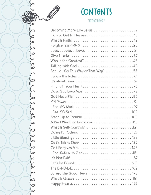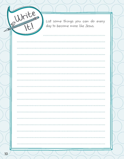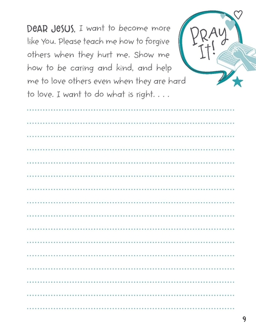 This fun, interactive journal for kids will help them grow in their faith. With Bible-related reading, praying, writing, drawing, and doing activities, the kids in your life will enjoy the varied prompts. Touching on topics that will enhance a child's faith, like Praying, Making Decisions, Waiting, Forgiving, Obeying, Being Kind, Being More Like Jesus, Loving Others, and more, kids ages 6 and up will be encouraged to read a scripture passage (a key Bible passage is included), pray about it (a prayer starter is included), journal their own thoughts and feelings (a journal prompt is included), and draw a related picture (a drawing prompt is included). Each topically arranged section wraps up with a related "doing" activity as well--encouraging your kids to live out their faith in real life!
