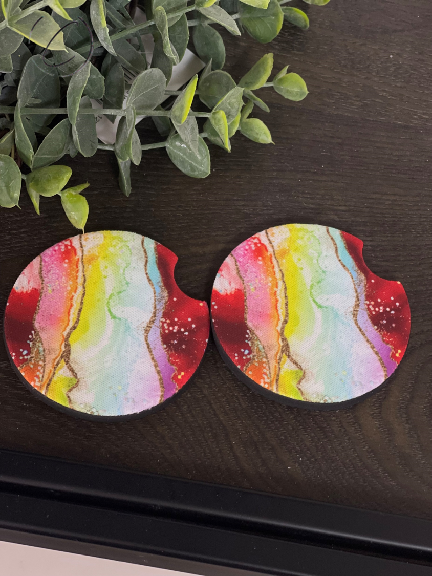 Introducing the stunning Red Rainbow Geode Car Coaster Set, a perfect blend of functionality and style for your vehicle. These coasters are designed to enhance your car's interior while providing a practical solution for keeping your cup holders clean. Made from high-quality neoprene, these coasters are built to last and withstand the rigors of daily use.