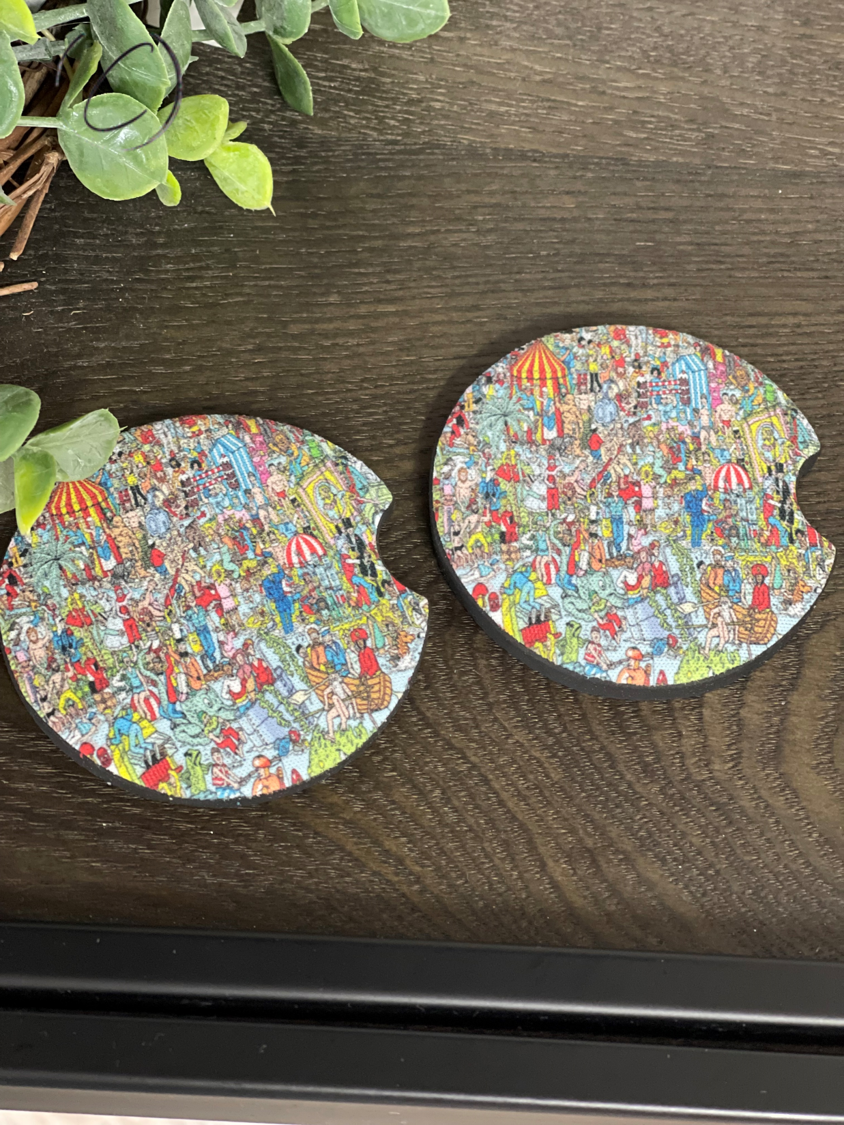 Where's Waldo Neoprene Car Coaster Set featuring vibrant design and durable material, perfect for car cup holders.