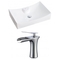 This product is a bundle (set of multiple products). This bathroom vessel sink set features a rectangle shape with a modern style. This product is made for above counter installation. DIY installation instructions are included in the box. This bathroom vessel sink set is designed for a 1 hole faucet and the faucet drilling location is on the center. This bathroom vessel sink set features 1 sink. This bathroom vessel sink set is made with ceramic. The primary color of this product is white and it comes with chrome hardware. Smooth non-porous surface; prevents from discoloration and fading. Double fired and glazed for durability and stain resistance. 1.75-in. standard USA-Canada drain opening. 26-in. Width (left to right). 17.75-in. Depth (back to front). 7-in. Height (top to bottom). All dimensions are nominal. This product can usually be shipped out in 1 day. Quality control approved in Canada. Each box on your order is physically opened-up and inspected to make sure only the highest quality product is shipped. We take and store photos of every single quality audit of every single order we ship. You can see them when you track your order on our website. THIS PRODUCT INCLUDE(S): 1x bathroom vessel sink in white color (226) 1x bathroom sink faucet in chrome color (16748).