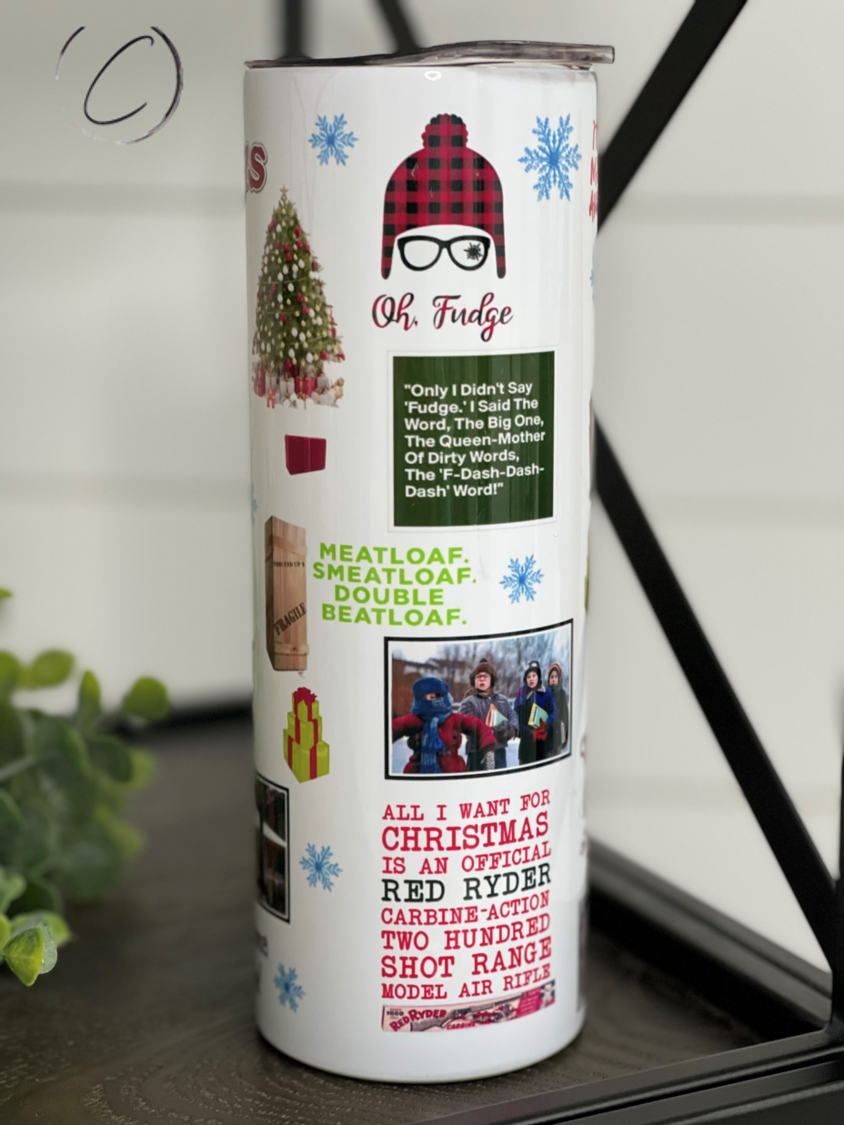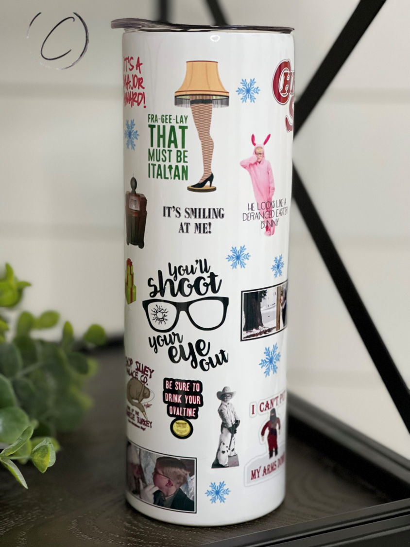 The A Christmas Story 20oz Skinny Tumbler is the perfect companion for your holiday beverages. This stylish tumbler features a unique design that is part of the cup itself, ensuring that it won't peel or fade over time like vinyl or stickers. Made with high-quality materials, this tumbler is built to last, making it an excellent choice for both everyday use and special occasions.