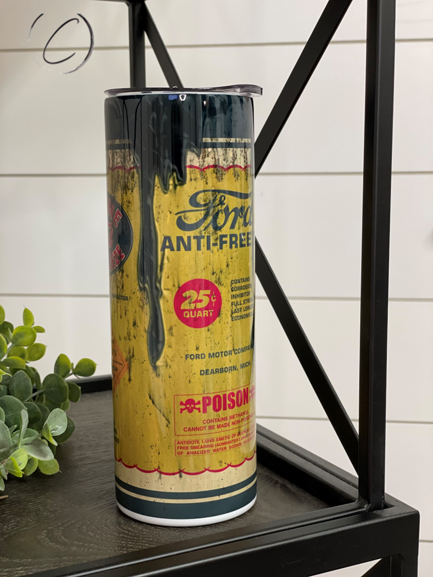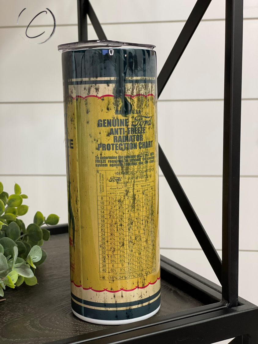 This 20oz tumbler is versatile enough for any occasion. Whether you're heading to work, going for a hike, or simply relaxing at home, the Ford Anti Freeze tumbler is the ideal choice for staying hydrated. Its sleek and slender design fits comfortably in your hand and most cup holders, making it easy to take with you wherever you go.