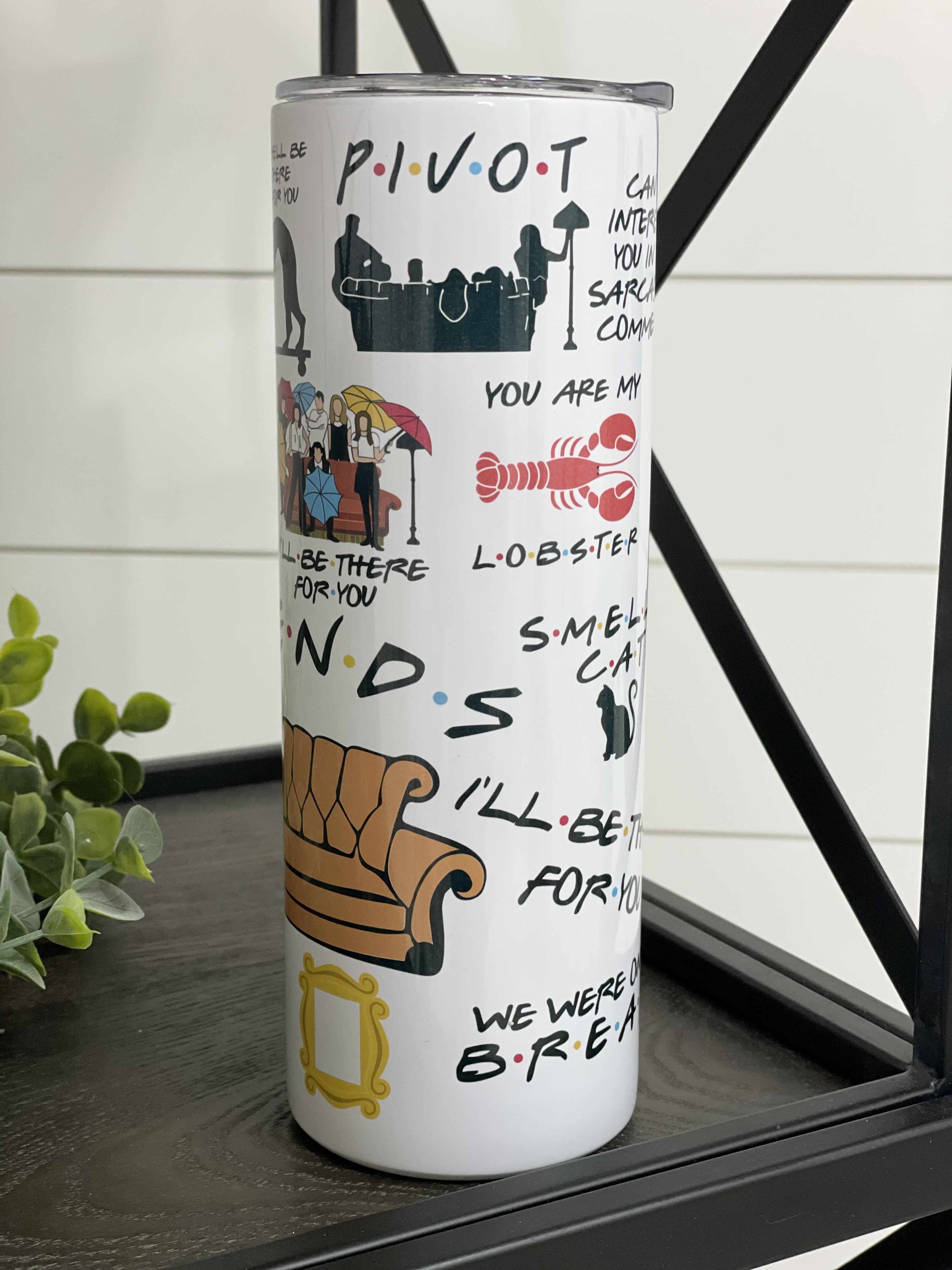 The F*R*I*E*N*D*S 20oz Skinny Tumbler is the ultimate accessory for fans of the iconic TV show. This stylish tumbler not only showcases your love for F*R*I*E*N*D*S but also provides a practical solution for staying hydrated throughout the day. With a generous 20oz capacity, it’s perfect for your favorite beverages, whether it's coffee, tea, or a refreshing smoothie.