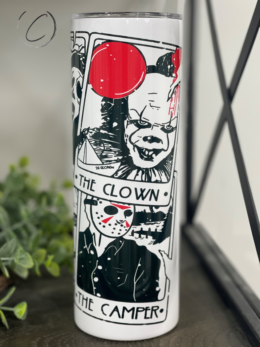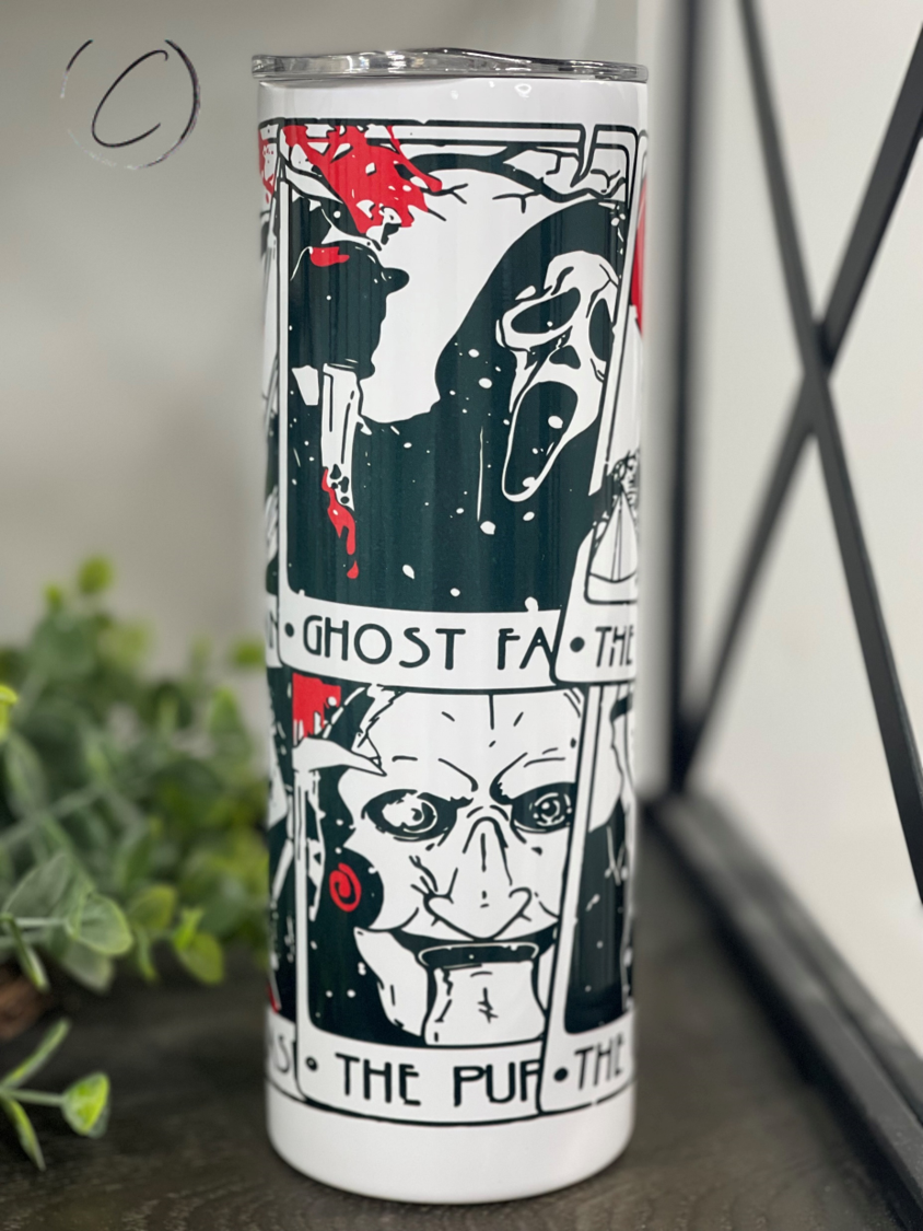 Introducing the Halloween Tarot Cards 20oz Skinny Tumbler, a must-have accessory for the spooky season! This tumbler features a stunning full wrap design that showcases intricate tarot card illustrations, making it a perfect addition to your Halloween festivities. Whether you're sipping on hot cider, pumpkin spice lattes, or your favorite cold beverages, this tumbler is designed to keep your drinks at the perfect temperature.