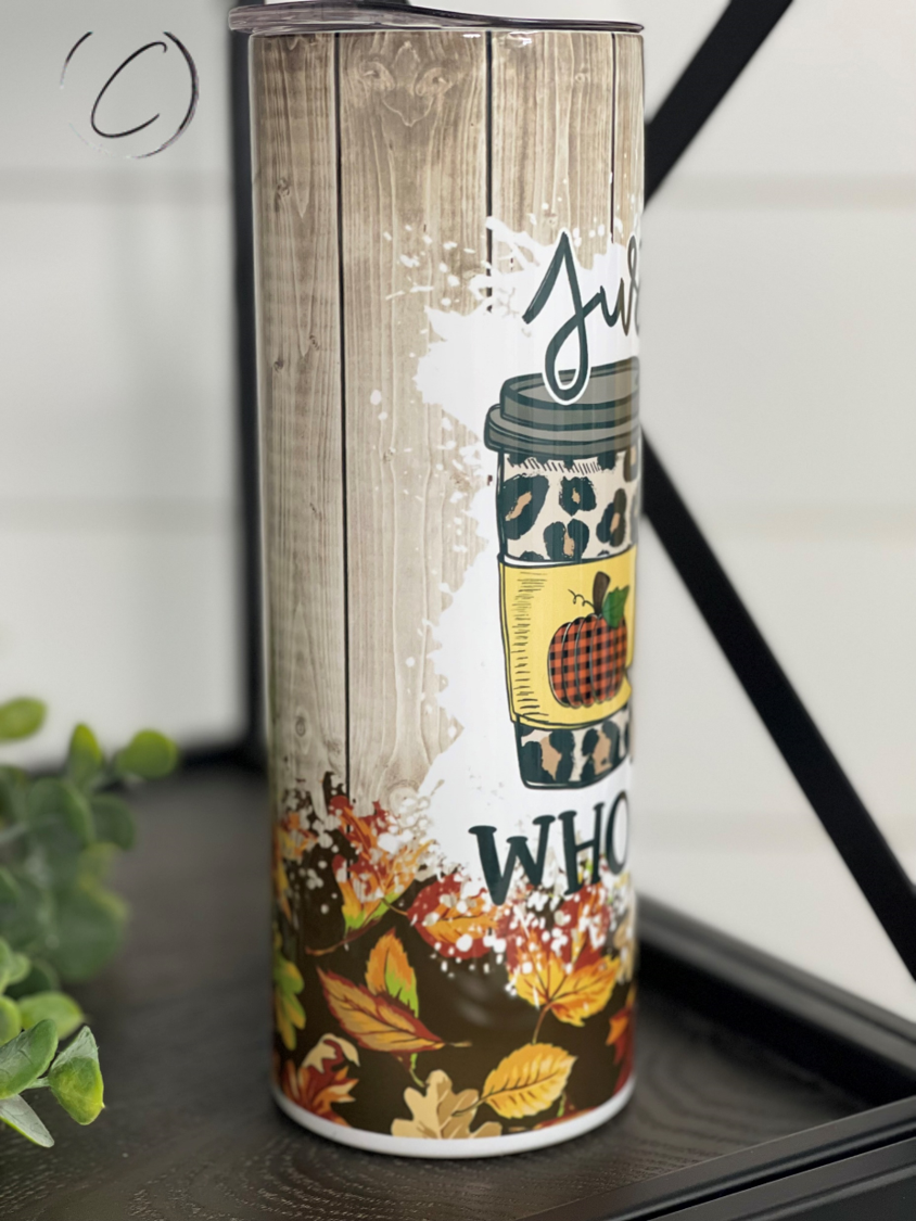 Just A Girl Who Loves Fall 20oz Skinny Tumbler with a vibrant autumn design and reusable straw.
