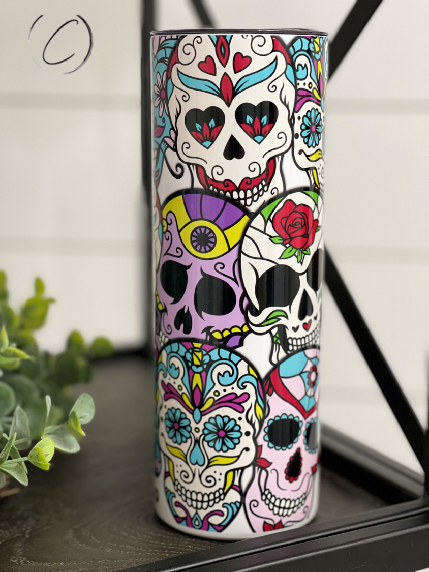 The Sugar Skulls tumbler boasts a full wrap design that ensures a stunning visual impact from every angle. However, please note that seams may be visible, and the image might not line up perfectly at the seam. This adds to the charm of the tumbler, as each piece is uniquely crafted, making it a one-of-a-kind item that stands out in any collection.