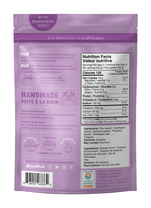 Organic flax seed, organic sunflower seeds, organic sesame seeds, organic pumpkin seeds, Himalayan salt