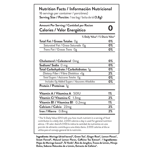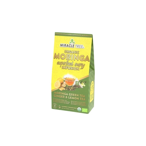 GOODBYE COFFEE, HELLO MORINGA! Supercharge your day with Miracle Tree's organic moringa superfood energy infusions. Savor in this Organic Green Tea & Moringa Leaf infusion with real pieces of organic Ginger and organic Lemon that will exhilarate the senses.