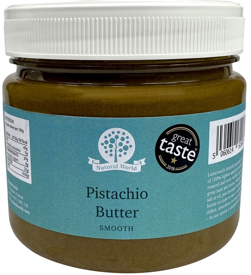 Luxuriously smooth pistachio butter made of 100% highest quality pistachios, lightly roasted and stone milled to preserve their great taste and aroma. With no added sugar, salt or oil, you can enjoy this highly nutritious butter on its own (try it on toasted bread) or use it in other dishes, smoothies, ice cream toppings, cakes and many more.