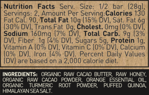 Ingredients: Organic Raw Cacao Butter, Raw Honey, Organic Raw Cacao Powder, Orange Essential Oil, Organic Turmeric Root Powder, Organic Puffed Quinoa, Himalayan Sea Salt
