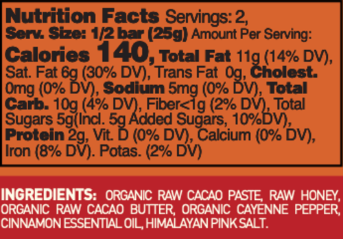 Ingredients: Organic Raw Cacao Paste, Raw Honey, Organic Raw Cacao Butter, Organic Cayenne Pepper, Cinnamon Essential Oil, Himalayan Pink Salt
