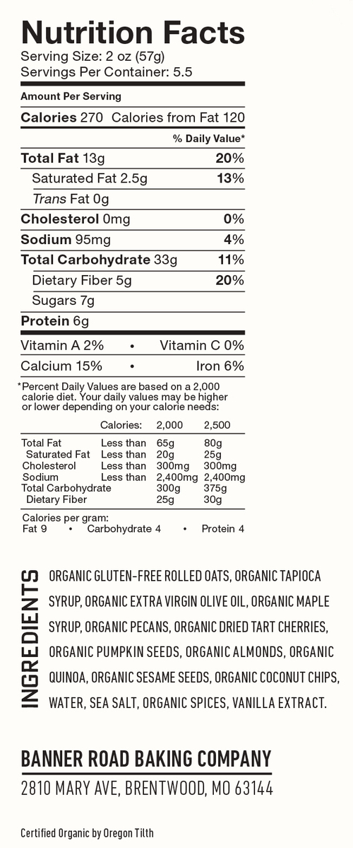 Clusters of organic oats, seeds & quinoa tossed with Missouri pecans, dried tart cherries and coconut chips and oven-baked to a sweet crunch with extra virgin olive oil & pure maple syrup.