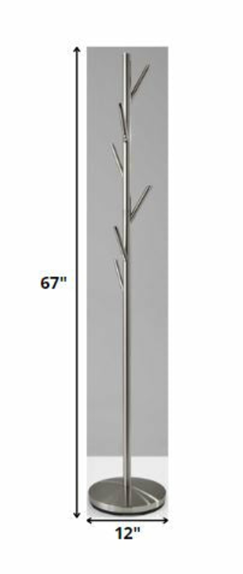 Introducing the 12 inches x 67 inches Brushed Steel Coat Rack, a perfect blend of functionality and modern design. This coat rack features six elegantly angled pegs that resemble the branches of a tree, making it not just a practical accessory but also a stunning piece of sculpture for your home. With its sleek brushed steel finish, it adds a touch of sophistication to any entryway or hallway.
