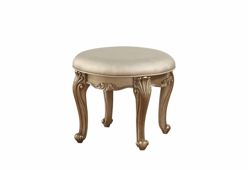 Champagne faux leather vanity stool with antique gold wood finish and floral accents, featuring Queen Anne style legs.