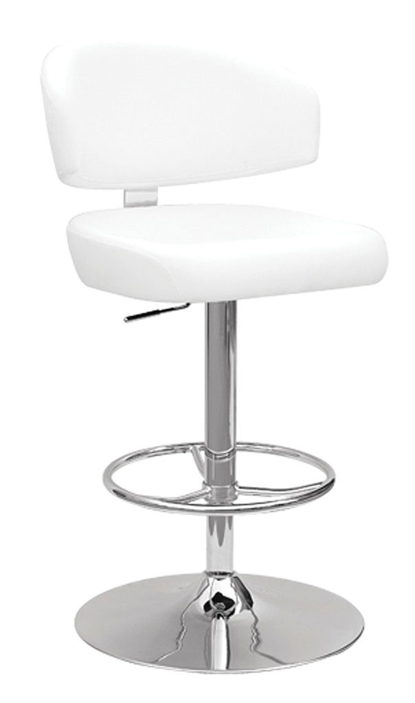 Stylish white and chrome swivel adjustable bar stool with padded seat and low backrest, perfect for modern dining areas.