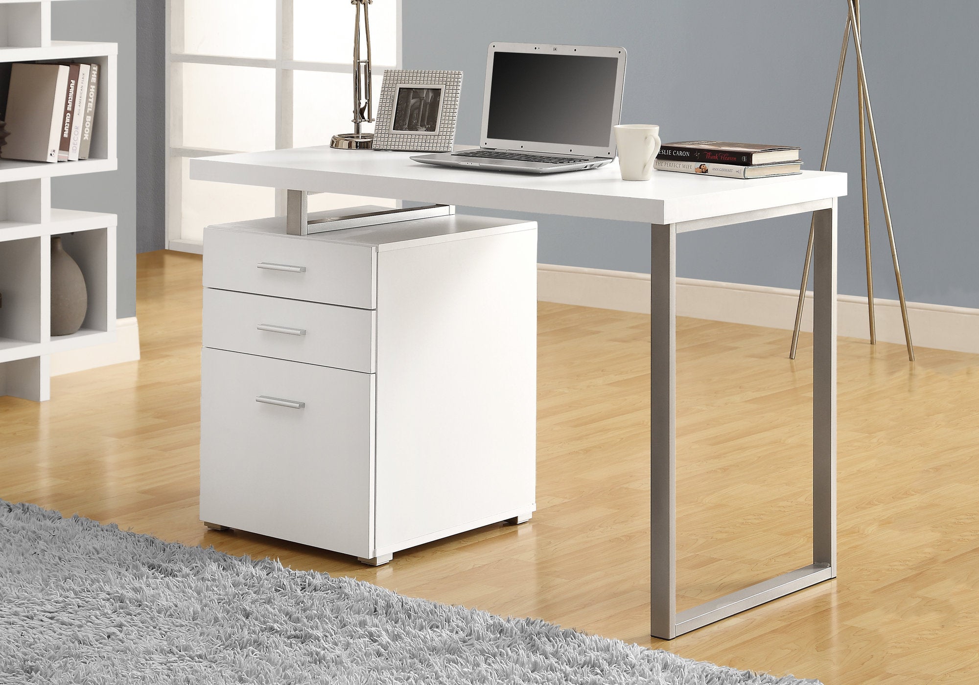 The sleek design of this computer desk makes it an ideal addition to any room. Its glossy finish in white and silver complements various decor styles, from modern to contemporary. The desk's dimensions of 30 inches in height, 23.75 inches in width, and 47.25 inches in depth provide ample workspace for your computer, books, and other essentials.