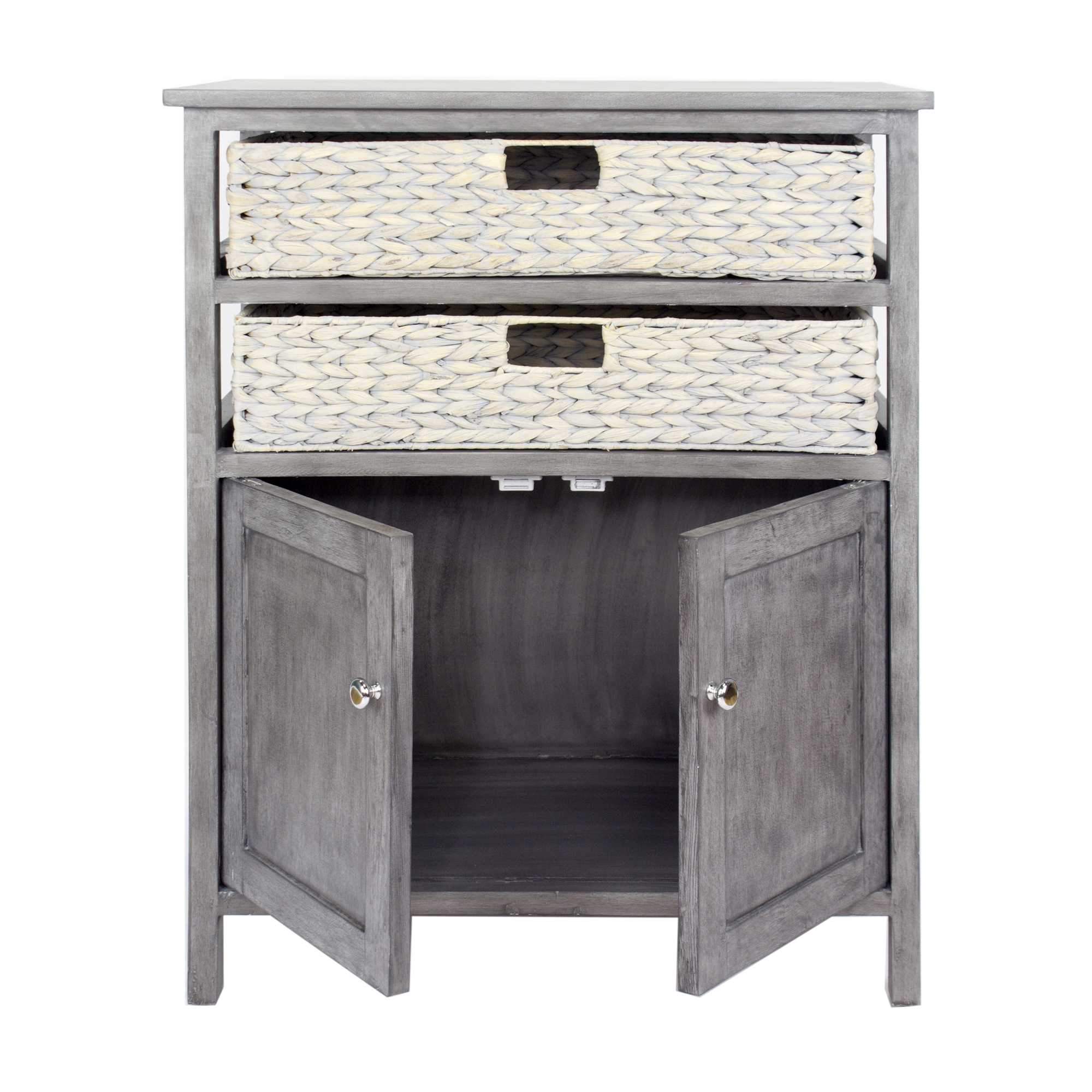 A stylish grey wood MDF accent cabinet with water hyacinth detailing, measuring 26.5" x 15" x 31.5", perfect for home organization.