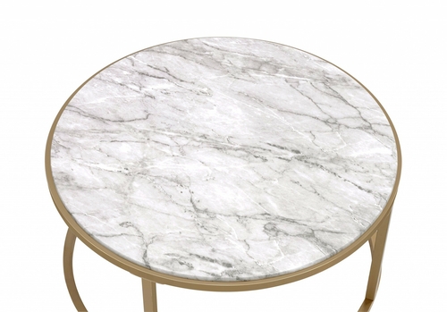 Introducing the stunning 36 inches x 36 inches x 16 inches Faux Marble Gold Metal Engineered Wood Coffee Table Set, a perfect blend of elegance and functionality. This exquisite two-piece occasional table set is designed to enhance the aesthetic of any modern living space. The combination of faux marble and gold metal creates a luxurious look that is sure to impress your guests.