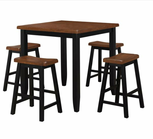 The 5pc Oak Black Rubber Wood Counter set is designed with aesthetics and functionality in mind. The wooden square legs of the four backless saddle stools are finished in black, providing a striking contrast to the oak tabletop. This combination not only enhances the visual appeal of your dining area but also ensures durability and stability. The backless stools are artfully crafted to fit into the table base, creating additional room space when not in use, making it an ideal choice for smaller dining areas.