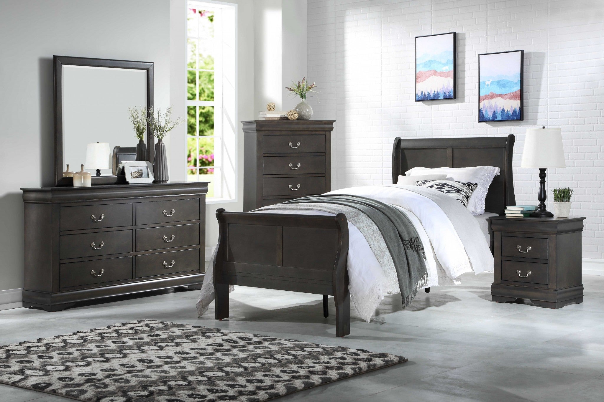 The dark gray wood finish of this full bed adds a sophisticated touch to any bedroom decor. The classic sleigh bed design features gentle curves and a timeless silhouette that complements both traditional and modern interiors. The simple moldings and luxurious pull handles enhance the overall aesthetic, making it a standout piece in your bedroom.