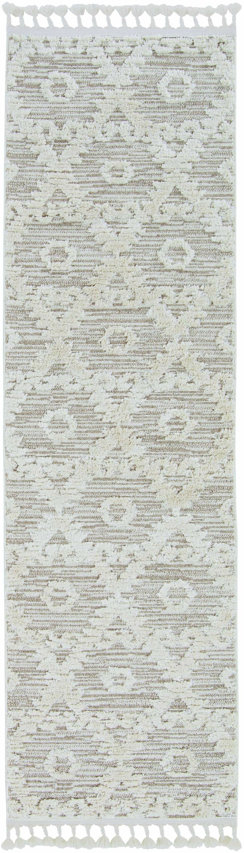 The geometric diamond pattern of this indoor area rug adds a contemporary touch to your decor. The ivory and beige color palette is versatile, allowing it to complement various interior styles, from modern to traditional. The decorative cut loop pile and fringe detail enhance its aesthetic appeal, making it a statement piece that draws attention.