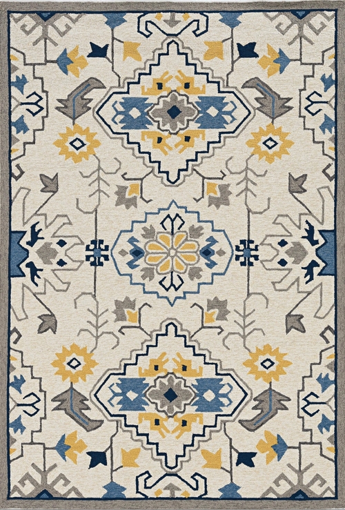 5x8 inches ivory hand-woven rug, suitable for indoor and outdoor use, showcasing traditional design and UV-treated polypropylene material.