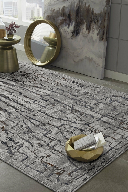 8 inches x 11 inches grey machine woven abstract indoor area rug with metallic highlights, showcasing a contemporary design suitable for living spaces.