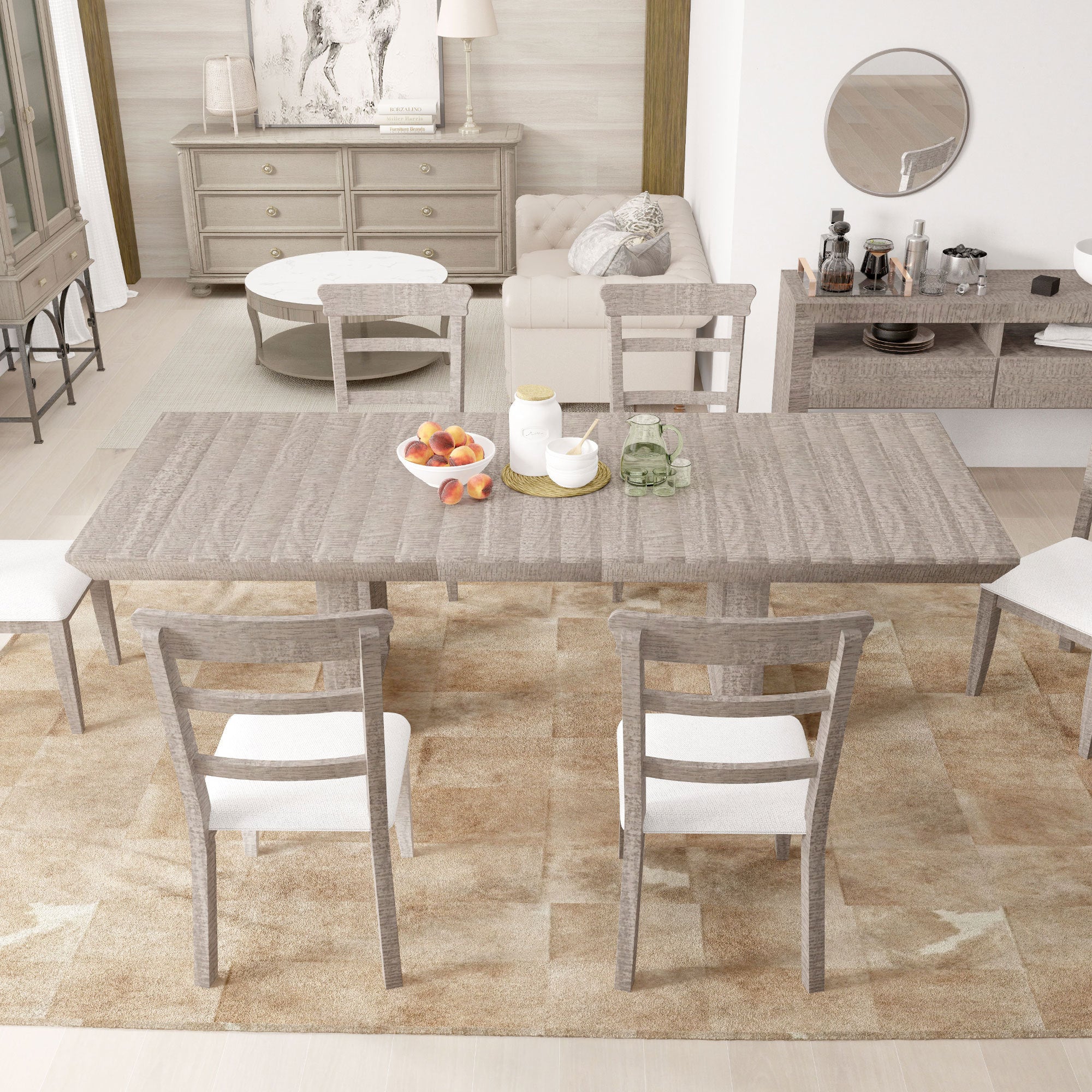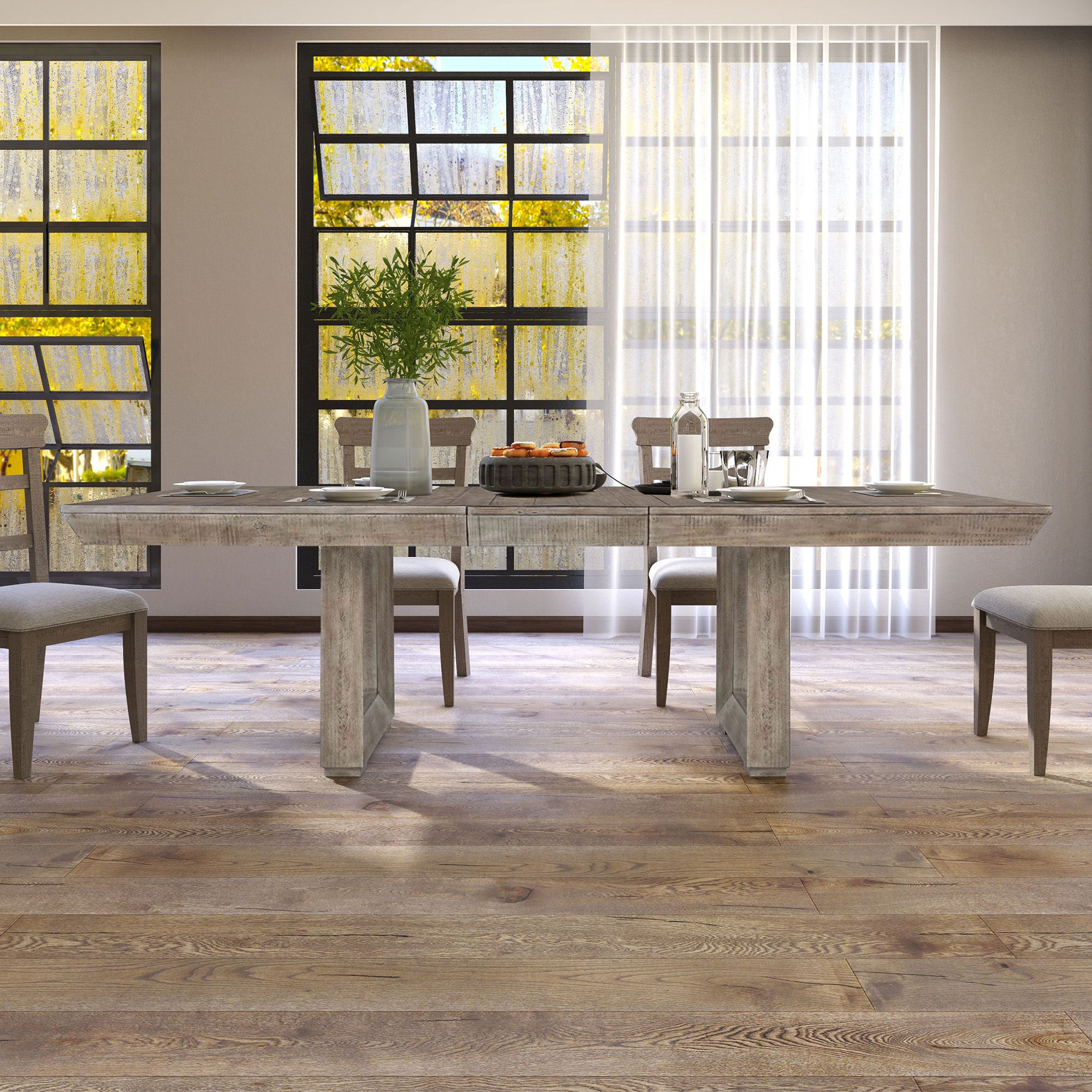 This farmhouse dining table features clean lines and a textured, wirebrush finish that adds a touch of elegance to your dining space. The large tabletop is perfect for family meals, allowing you to create a warm and inviting atmosphere for your guests.