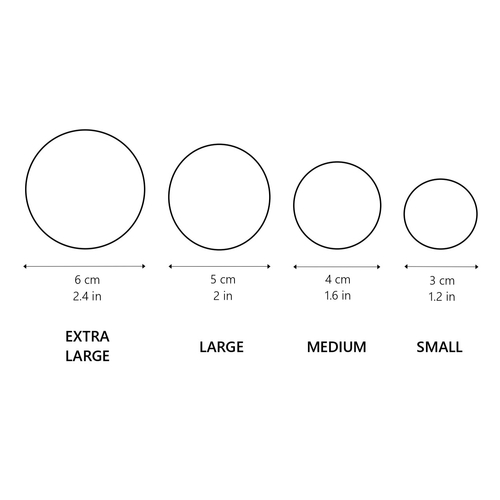 DIAMETER: small - 3 cm (1.2 in), medium - 4 cm (1.6 in), large - 5 cm (2 in), extra large - 6 cm (2.4 in).