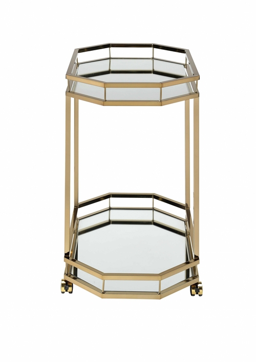 Champagne finish metal serving cart with two mirror shelves, showcasing a stylish design perfect for entertaining.