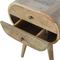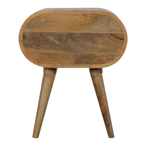 Circular Bedside. This round style bedside has been constructed from 100% solid mango wood in an oak-ish finsh. It features 2 drawers which provide great storage and will come in handy before bedtime. Some other features include 4 Nordic style legs and shiny knobs on the drawers. It can be used alone or be partnered with the other rounded furniture pieces from the collection.