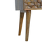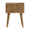 Diamond Carved Bedside with 2 Drawers. The main feature of this bedside is the hand carved cube drawer fronts which make the pieces from this collection stand out. It has been constructed from 100% solid mango wood in an oak-ish finish and stands on 4 Nordic style legs. It can be partnered with the other pieces from the range or stand individually as its style is versatile and can fit into different types of interiors.