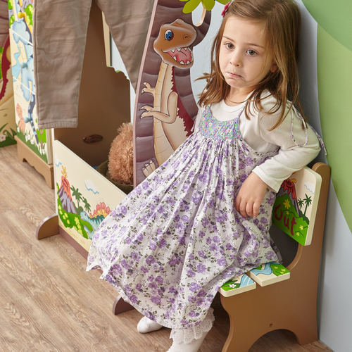 Give your little one a break with Fantasy Fields' Dinosaur Time Out Chair. Maybe they over did it at play time or just need to take a breath; the time out chair is the perfect locale. Hand painted with images of T-Rex and an erupting volcano in the back ground. This is a great place to let your child relax and unwind. Some assembly required. Perfect for ages 2 and up. Travel back to the Jurassic period with dinosaurs large and small. Let your little explorers enjoy a foreign land full of adventure and excitement with our playful Dinosaur theme. A volcanic landscape home to some of the cutest dinosaurs known to man make our Dinosaur range fun and exciting. Bring durable lasting pieces wonder and adventure into your child’s playroom with a whole world of Jurassic creatures. Introducing Fantasy Fields by Teamson a brand that inspires the imagination of our children and the world they live in. It’s our mission at Fantasy Fields to build furniture that builds minds that inspires adventures and that transports your child into a world of their very own creation. Each piece of Fantasy Fields is wooden-made hand-carved and hand-painted in our workshop to ensure the highest quality durability and safety using non-toxic materials and paint. All our themes have been created with LOVE for children. Mix it. Match it. But most of all imagine. Welcome to the world of Fantasy Fields. From the whimsical “Magic Garden” the classic and cute “Crackled Rose” to the exciting and magical “Transportation” collection; our artists add their own touch to every piece with beautifully executed hand painted accents. It’s a magical experience giving life to our pieces little by little and transforming them into imagination for your little ones. This beautiful work is what makes us proud of our product and confident that your loved ones will love them and cherish them for years to come.