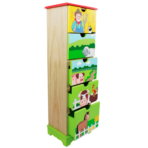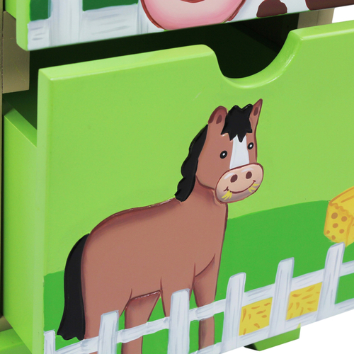 Giddy up and get yourself to the farm! Fantasy Fields' 5 Drawer Farm Cabinet offers the best place to store all your children’s little keepsakes from socks and onesies to barrettes and bows and all sorts of little clothes. The cabinet is hand carved and painted with quality wood and beautiful hand sculpted images of farm animals. Visit with a horse, have an adventure with a cow, sneak about with a sheep, protrude the pathways with a pig and get festive with a farmer and his pup. When a trip to the farm isn’t possible, bring it home! Perfect for all ages.