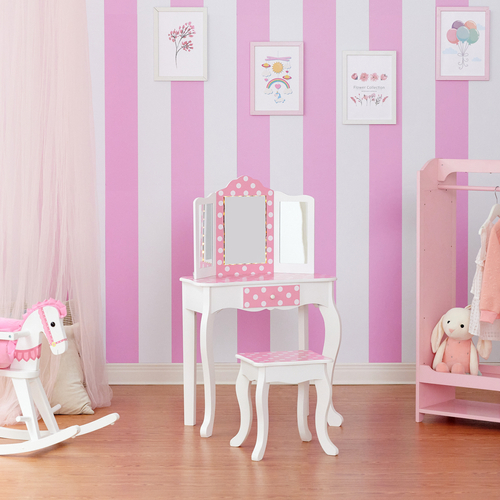 Our cute pink polka dot Gisele Kids Vanity would make the perfect addition any bedroom or playroom. Constructed with high-quality durable wood, this kids’ vanity comes with a central pull-out draw for storing their favourite trinkets, a three-panel foldable reflective mirror with LED lights, and a matching polka dot stool. Give your child a magical place to get ready.