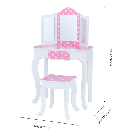 DETAILS: The perfect addition to their playroom or bedroom. The Gisele pink and white polka dot kids’ vanity features an openable central drawer for storing trinkets, a foldable 3-panel vanity mirror, and matching polka dot stool.