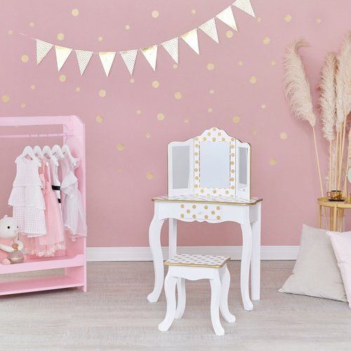 The Fantasy Fields Polka Dot Print Vanity Set is the perfect pick for a kid with big personality! The sturdy two-piece set features a white vanity and stool with large gold polka dots and complimentary gold trim. The vanity boasts a 3-angle mirror with LED lights for central mirror, a spacious tabletop to organize jewelry and lip gloss, and a sliding drawer to tidily tuck small items away.