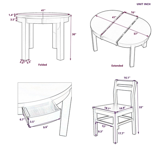 | Highlights | Extendable Dining Table // 16" Removable Leaf // Storage Drawers // Heavy Table Legs// Solid Wood Frame // Ergonomic Chair Back // Dining Set for 4 |