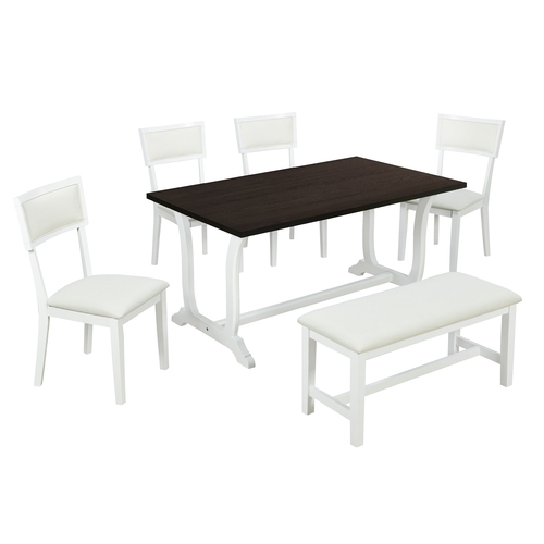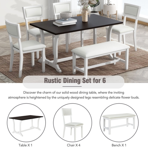 - [Rustic Dining Set for 6] This 6-piece dining set exudes farmhouse charm with its solid wood frame, a rectangular tabletop, and legs shaped like flower buds for a quaint touch. The trestle table anchors the set, accompanied by padded chairs and a bench, offering comfortable seating for 6. The arched chair backs add a classic touch to this delightful dining ensemble.