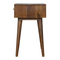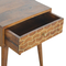 Gold Art Pattern Bedside. This bedside is endlessly versatile and will prove handy all over your home. It has been constructed from 100% solid mango wood and has a beautiful chestnut finish with a patterned brass inlay on the drawer fronts. It also features shiny knobs and 4 Scandinavian styled legs.