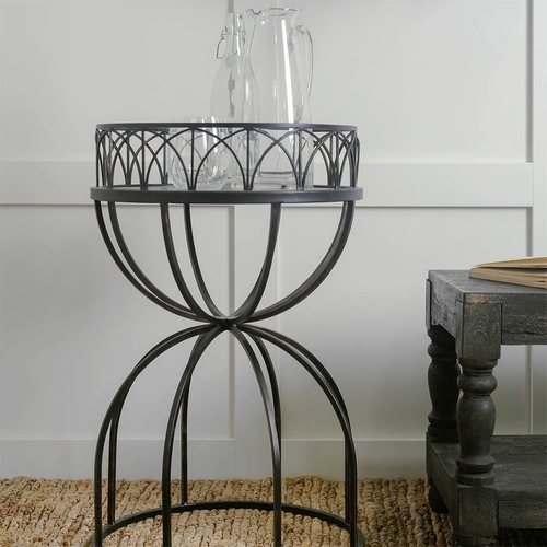 The Hour-Glass Mirrored Top Accent Table with Black Iron Base is a stunning piece that combines functionality with elegance. This accent table is designed to be a focal point in any room, thanks to its unique hour-glass shape and beautiful mirror-lined tabletop. The removable top doubles as a serving tray, making it not only a decorative piece but also a practical addition to your home.