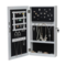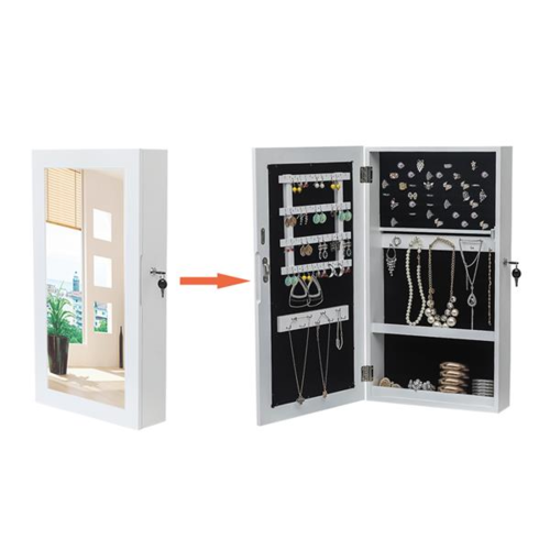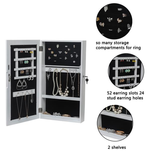 1. Large Capacity: It makes great use of the space to store more of your jewelry and other accessories,It contains 2 shelves,24 stud earring holes, 52 earring slots, so many storage compartments for ring and plenty of necklace hooks