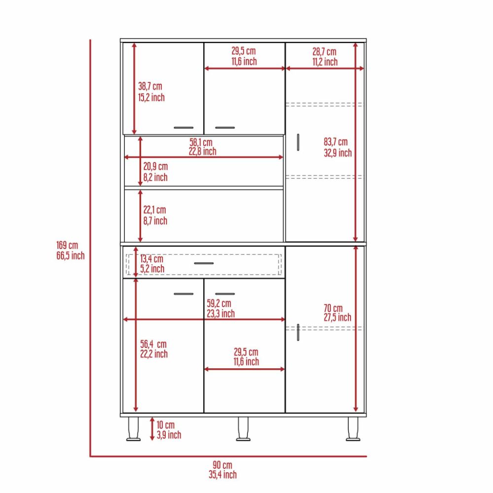 This pantry features a total of ten shelves, allowing you to organize your dishes, pots, pans, and other household items efficiently. The six covered door panels ensure that your kitchen remains tidy and clutter-free, while the large drawer is ideal for storing silverware and dining utensils. Whether you have a small kitchen or a large one, the Piacenza pantry is designed to maximize your storage space.