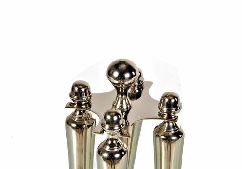 A stylish aluminum multifunctional decor set featuring a magnifying glass, letter opener, bottle opener, and candle snuffer elegantly displayed on a stand.