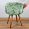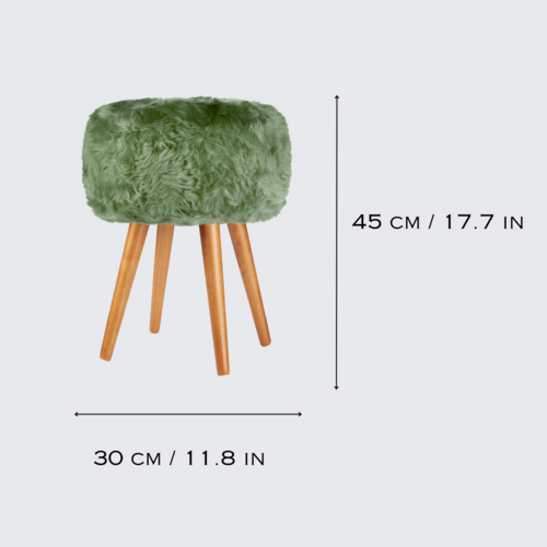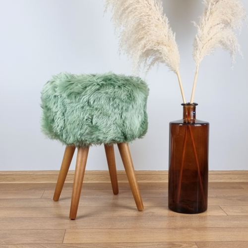 Green sheepskin stool with oak legs – a perfect blend of luxury and natural charm. A small furry mint green chair can be a playful detail in a child's room. The luscious texture of the green sheepskin adds a cozy and inviting feel, while the sturdy oak legs ensure durability and a timeless aesthetic.